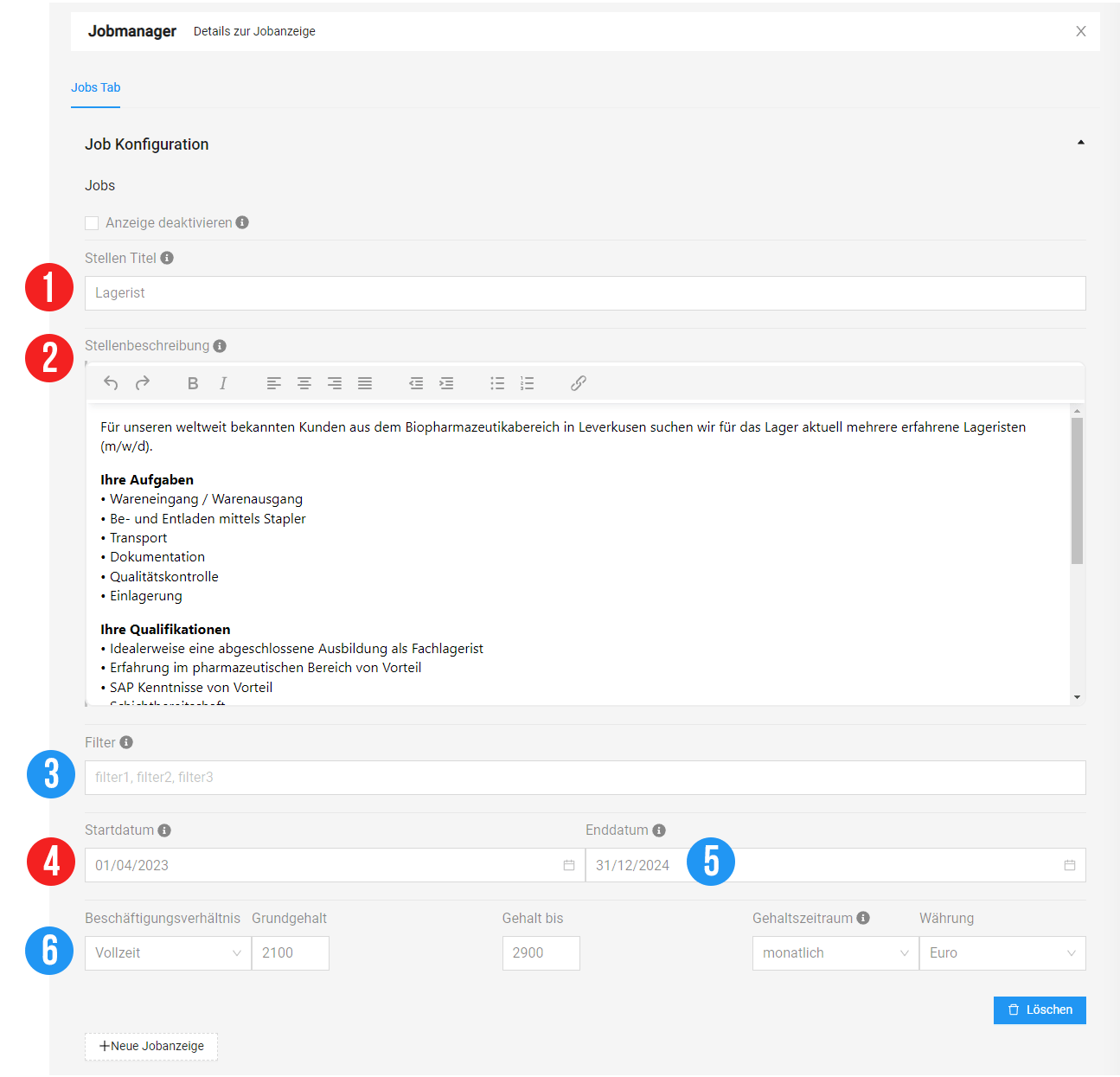 Nutzen Sie das Feld „Stellenbeschreibung„, um umfassende Informationen zur ausgeschriebenen Position bereitzustellen. Dies umfasst Details zu Qualifikationen, Aufgaben und den gebotenen Vorteilen. Je präziser und informativer Ihre Stellenbeschreibung ist, desto besser können interessierte Kandidaten die Relevanz der Position für ihre Fähigkeiten und Interessen beurteilen.